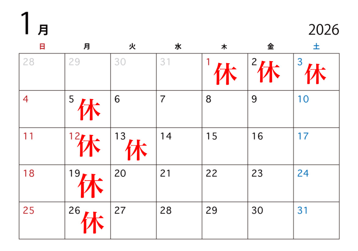 当店では下記の通り、1月の営業スケジュールを予定しております。